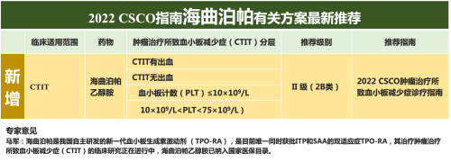 海曲泊帕乙醇胺片作为我国自主研发上市的新一代的TPO-RA类药物,已获批免疫性血小板减少症(ITP)和重型再生障碍性贫血(SAA)两个适应症,已进入国家医保目录,其治疗CTIT的临床研究正在进行中。首次发布的CTIT诊疗指南推荐包含海曲泊帕乙醇胺在内的TPO-RA,用于治疗CTIT有出血、CTIT无出血(血小板计数(PLT)≤10×109/L和10×109/L9/L),推荐级别均为II级(2B类证据)。