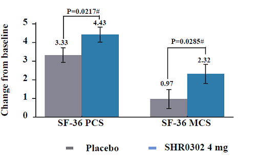 图3.艾玛昔替尼组与安慰剂组SF-36 PCS和MCS较基线变化情况